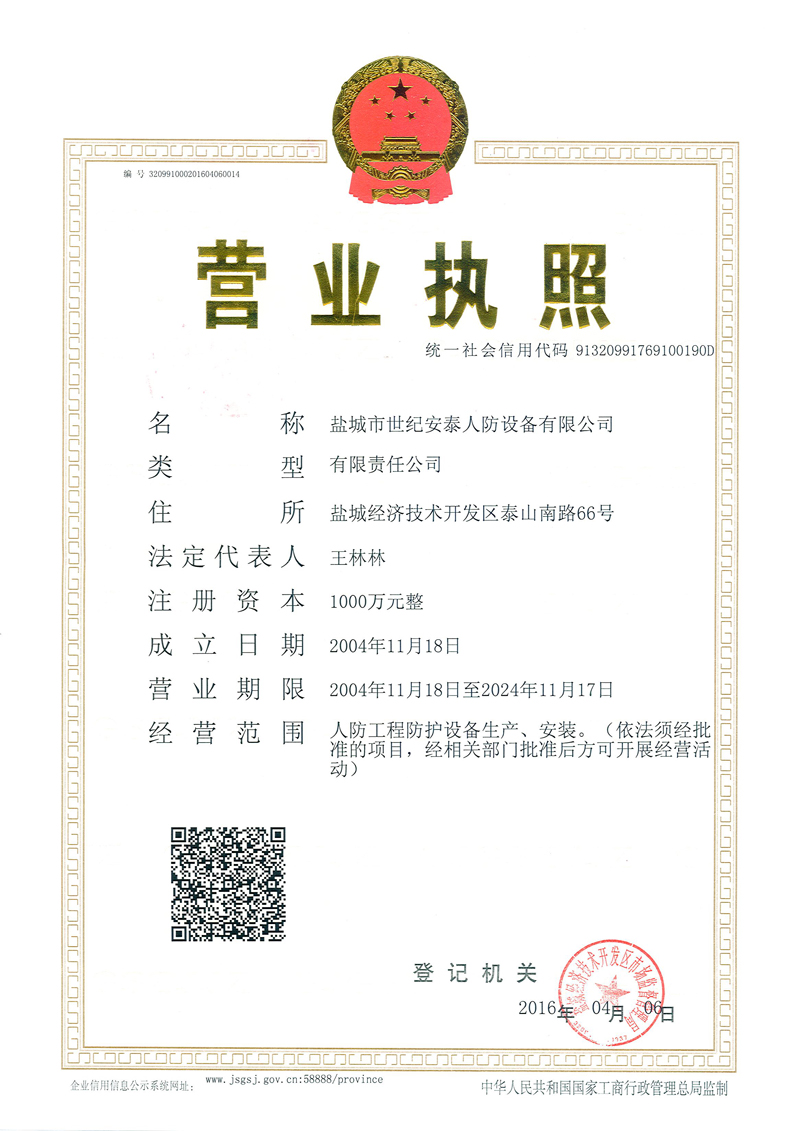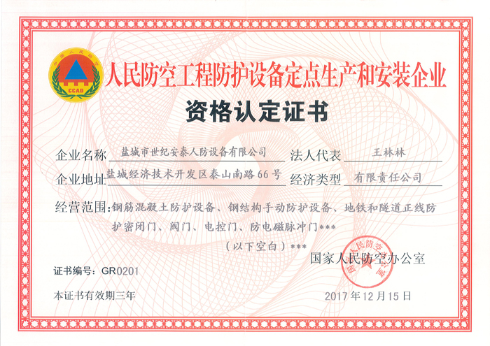 鹽城市世紀安泰人防設(shè)備有限公司是國家人民防空辦公室批準成立的人防工程防護設(shè)備定點生產(chǎn)和安裝企業(yè),是專業(yè)生產(chǎn)、銷售、安裝人防防護設(shè)備產(chǎn)品的企業(yè),公司主要生產(chǎn)鋼筋混凝土防護設(shè)備、鋼結(jié)構(gòu)手動防護設(shè)備、閥門、電控門、防電磁脈沖門、地鐵和隧道正線防護密閉門等各類產(chǎn)品并對產(chǎn)品進行安裝、調(diào)試、維修及保養(yǎng),公司生產(chǎn)的各種規(guī)格的人防工程產(chǎn)品,均按國家人防總參工程兵四所及中國建筑標準設(shè)計研究院提供的圖紙生產(chǎn),符合各種人防工程設(shè)計要求,是各類地下人防工程選用的理想產(chǎn)品。本公司已通過GB/T19001-2008IDT ISO9001:2008國家質(zhì)量體系認證。
